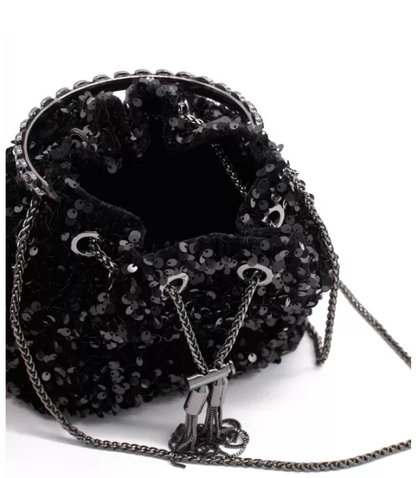 Bolso Bombín Cubierto Con Lentejuelas. Asa Metálica Circular Y Cadena Metálica Con Función Bandolera. Forro Interior Textil.