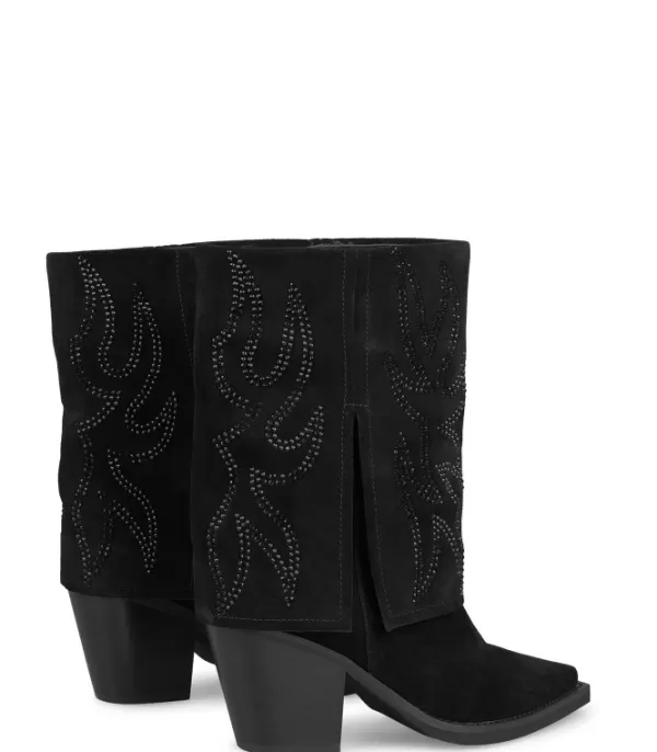 Botas De Mujer Realizadas En Piel Con Adorno De Alas De Pedrería. Punta Puntiaguda Y Tacón En Bloque. La Altura Del Tacón Es De 8,5 Cm.