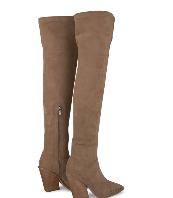 Bota Mosquetera Para Mujer Realizada En Piel Con Tachuelas En La Puntera. Puntera Cónica Y Tacón En Bloque. La Altura Del Tacón Es De 10 Cm.