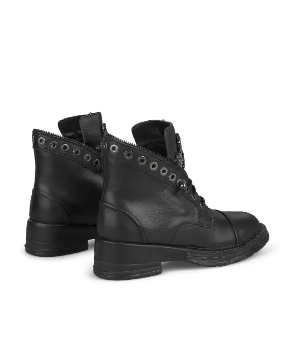 Botines Planos Realizados En Piel. Parte Superior Baja. Adorno De Pedrería En La Suela. Cierre Con Cordones. La Altura Del Tacón Es De 3 Cm.
