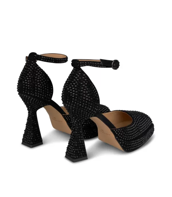 Sandalia De Tacón Embudo Cubierto De Pedrería. Cierre Con Hebilla. Punta Cuadrada. La Altura Del Tacón Es De 10 Cm.