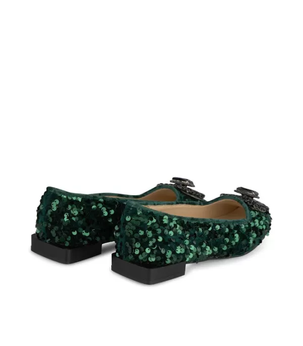 Bailarina Cubierta Con Lentejuelas Y Broche De Pedrería. Punta Cuadrada. La Altura Del Tacón Es De 2,3 Cm.