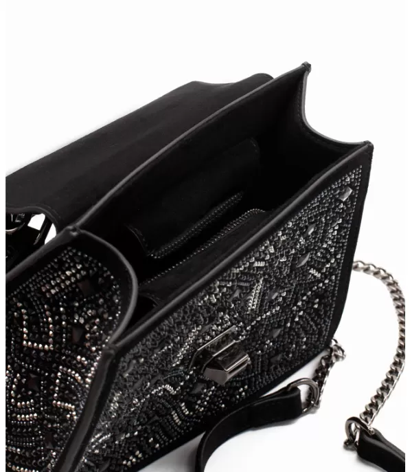 Mini Bolso Con Acabado En Glitter Y Tachuelas. Correa De Mano Y Correa Larga De Cadena Metálica Con Función De Bandole…