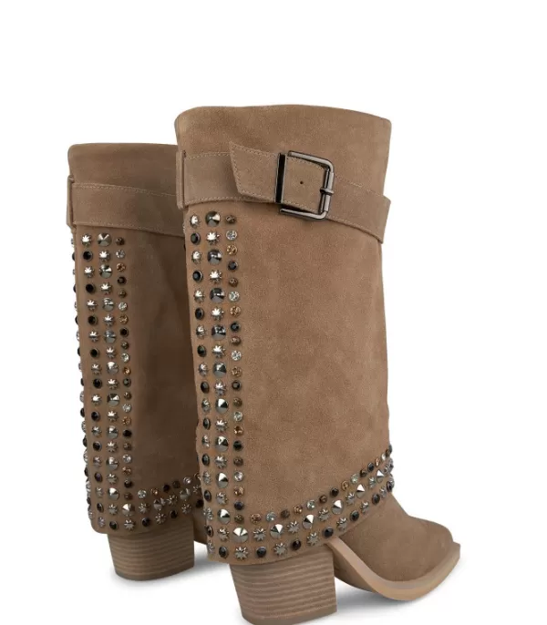 Botas De Mujer Realizadas En Piel Con Adorno De Tachuelas. Punta Puntiaguda Y Tacón En Bloque. La Altura Del Tacón Es De 10 Cm.