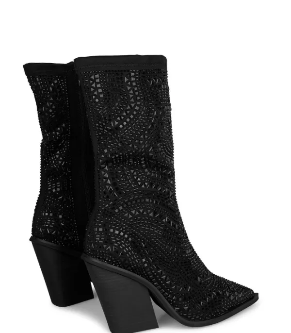 Bota De Mujer Recubierta De Pedrería Con Puntera En Punta Y Tacón Cuadrado. La Altura Del Tacón Es De 10 Cm.