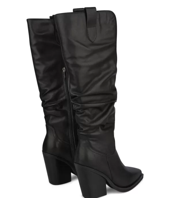 Botas De Cuero Para Mujer Con Parte Superior Arrugada. Puntera Cónica Y Tacón En Bloque. La Altura Del Tacón Es De 10 Cm.