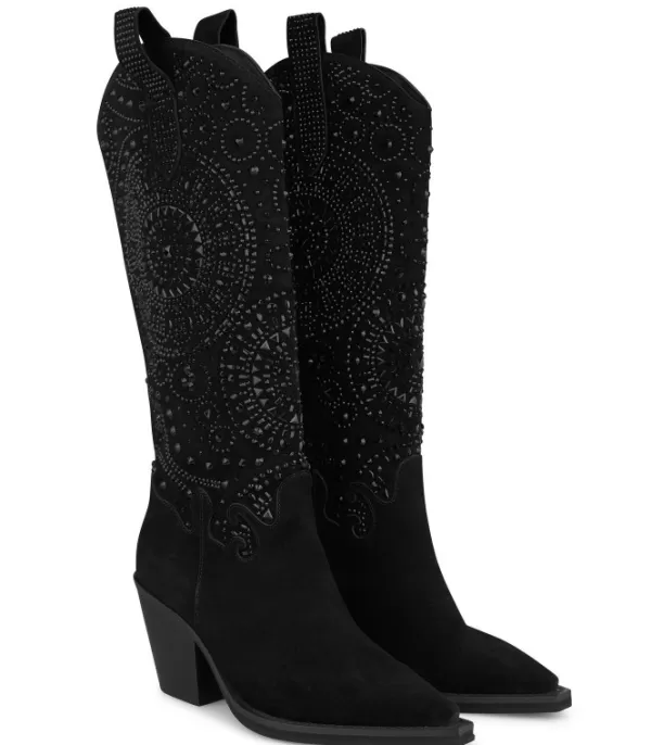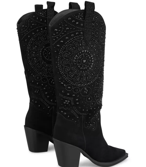 Bota De Mujer De Piel Con Adorno De Strass En La Caña. Punta Puntiaguda Y Tacón En Bloque. La Altura Del Tacón Es De 8,5 Cm.