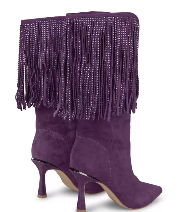 Bota De Tacón Realizada En Piel Con Flecos Cubiertos De Pedrería. Vástago De Bota Mediano. La Altura Del Tacón Es De 8,8 Cm.