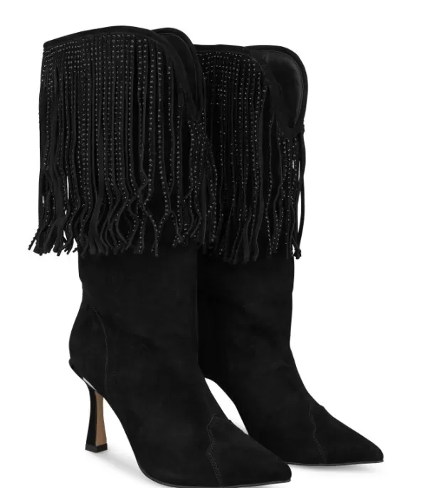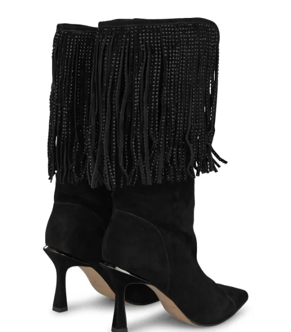 Bota De Tacón Realizada En Piel Con Flecos Cubiertos De Pedrería. Vástago De Bota Mediano. La Altura Del Tacón Es De 8,8 Cm.