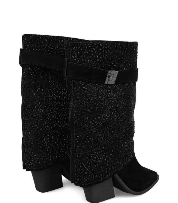 Bota Realizada En Piel Con Pedrería En La Caña Y Broche En La Parte Superior. Punta Puntiaguda Y Tacón En Bloque. La Altura Del Tacón Es De 10 Cm.