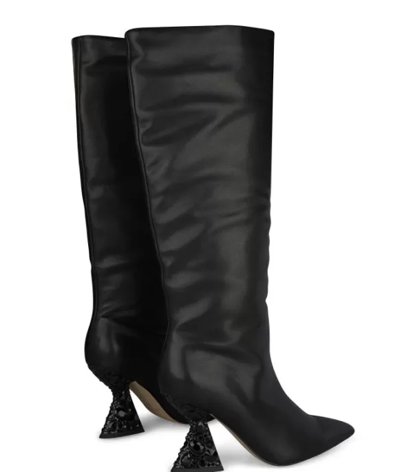 Bota De Piel Con Tacón Embudo. Talón Cubierto De Pedrería. Puntera Cónica. La Altura Del Tacón Es De 9 Cm.