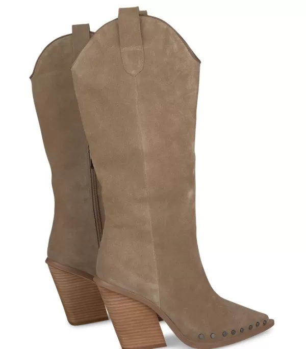 Botas De Mujer De Piel Con Tachuelas En La Puntera. Puntera Cónica Y Tacón En Bloque. La Altura Del Tacón Es De 10 Cm.