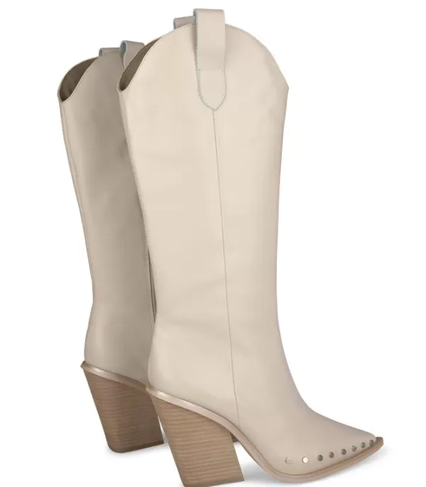 Botas De Mujer De Piel Con Tachuelas En La Puntera. Puntera Cónica Y Tacón En Bloque. La Altura Del Tacón Es De 10 Cm.