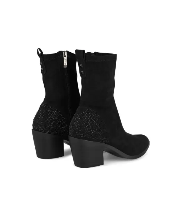 Botines De Mujer Con Pedrería En El Talón. Punta Puntiaguda, Cierre De Cremallera Y Tacón En Bloque. La Altura Del Tacón Es De 7,4 Cm.