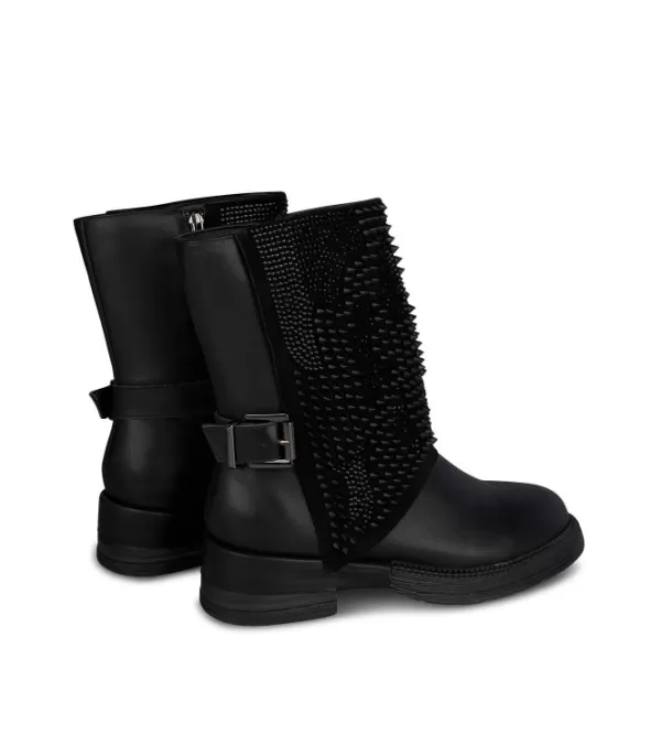 Botines De Piel Con Tachuelas En La Caña. Puntera Redondeada Y Plataforma Plana. La Altura Del Tacón Es De 3 Cm.