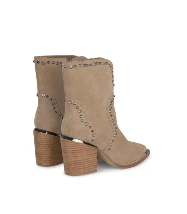 Botines Elaborados En Piel Con Caña Arrugada. Detalle De Tachuelas. Flecos Con Pedrería Cuelgan En La Parte Posterior. Punta Puntiaguda Y Tacón En Bloque. El