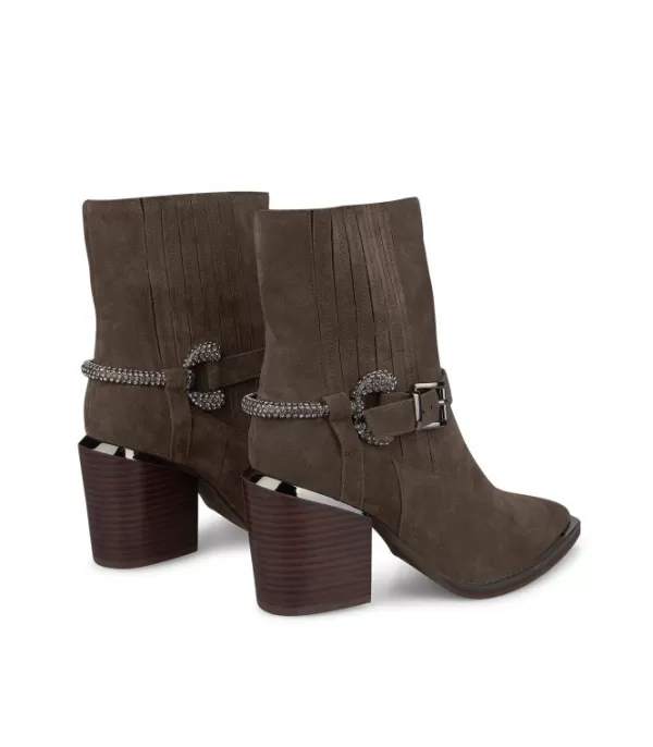 Botines Confeccionados En Piel Con Detalle De Cinturón De Pedrería. Punta Cuadrada, Tacón En Bloque. La Altura Del Tacón Es De 8 Cm.