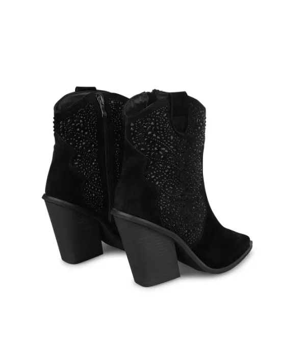 Botines De Mujer Elaborados En Piel Con Pedrería. Punta Puntiaguda Y Tacón En Bloque. Tacón Bajo. La Altura Del Tacón Es De 10 Cm.