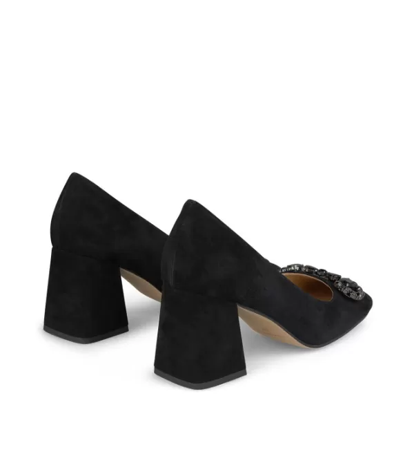 Zapato De Tacón Realizado En Piel Con Adorno De Estribo Cubierto De Pedrería. Tacón De Bloque Y Puntera Cuadrada. La Altura Del Tacón Es De 7,5 Cm.
