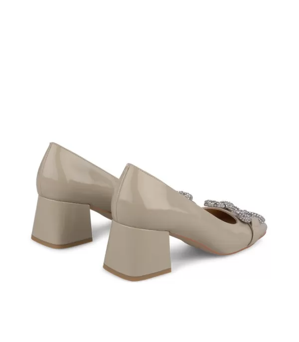 Zapato De Tacón Realizado En Piel Con Adorno De Estribo Cubierto De Pedrería. Punta Cuadrada Y Tacón En Bloque. La Altura Del Tacón Es De 7,5 Cm.