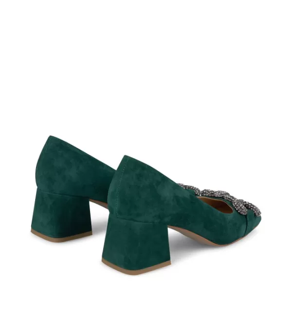 Zapato De Tacón Realizado En Piel Con Adorno De Estribo Cubierto De Pedrería. Punta Cuadrada Y Tacón En Bloque. La Altura Del Tacón Es De 7,5 Cm.