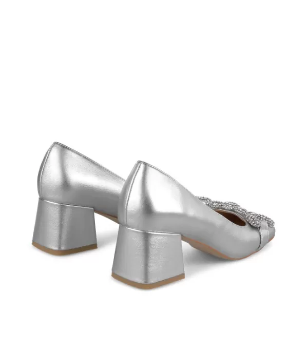 Zapato De Tacón Realizado En Piel Con Adorno De Estribo Cubierto De Pedrería. Punta Cuadrada Y Tacón En Bloque. La Altura Del Tacón Es De 7,5 Cm.