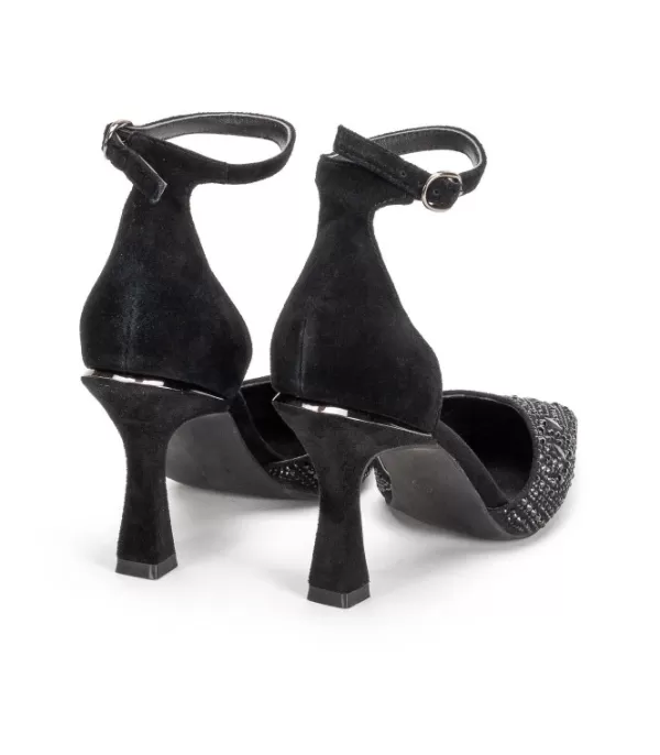 Zapatos De Punta Puntiaguda Cubiertos Con Pedrería. Cierre Con Hebilla. La Altura Del Tacón Es De 8,8 Cm.
