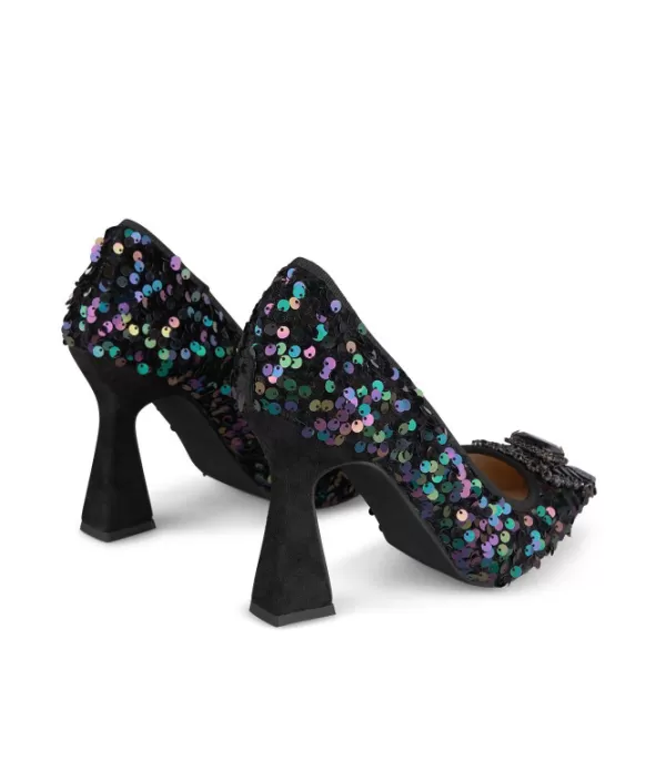 Zapato De Tacón Con Punta En Punta Recubierta De Lentejuelas Y Tacón Embudo. Detalle De Broche. La Altura Del Tacón Es De 10 Cm.