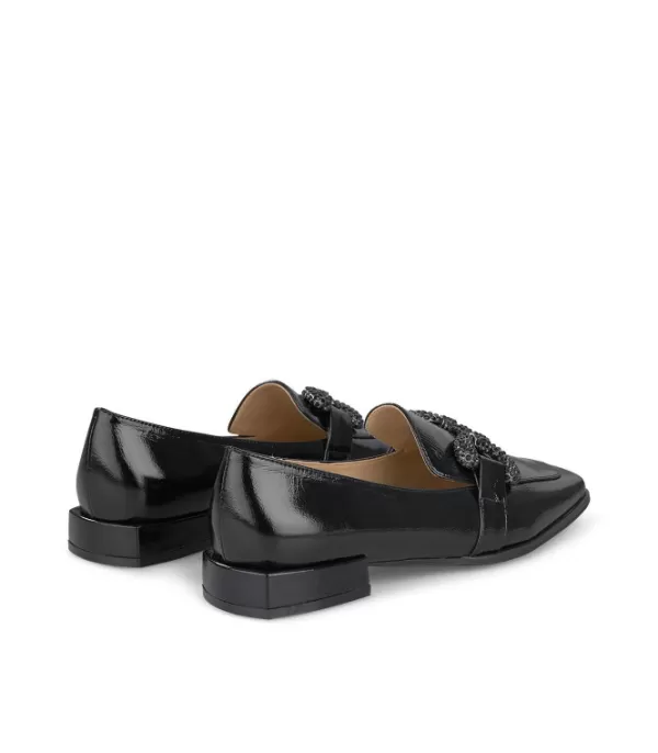 Zapato Plano Realizado En Piel Con Adorno De Estribo Cubierto De Pedrería. La Altura Del Tacón Es De 2,3 Cm.